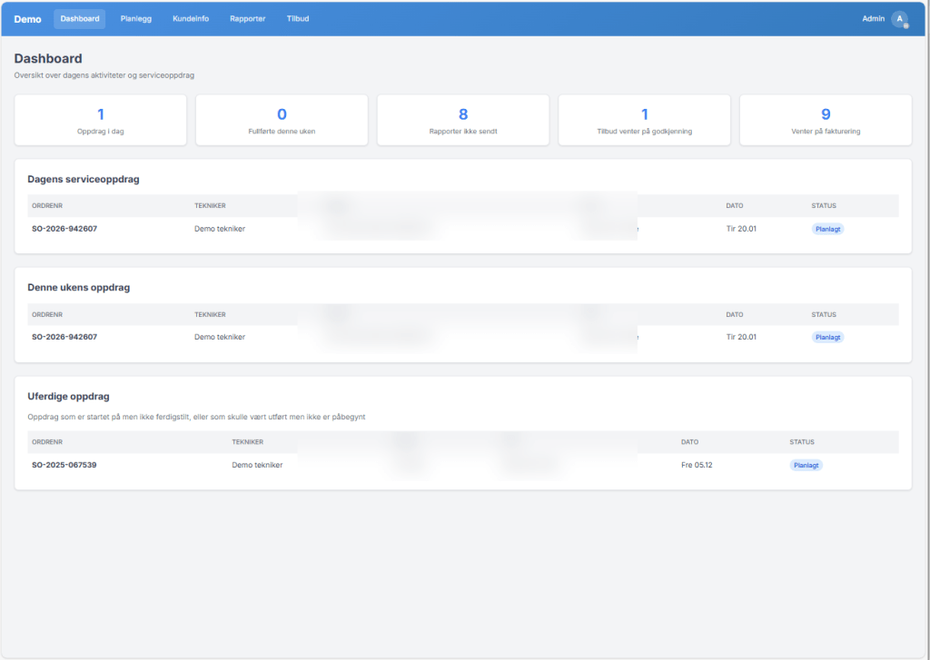 Serviceleder og administrasjon får oversikt over dagens oppdrag, uferdige jobber, manglende rapporter og hva som er klart for fakturering – samlet på ett sted.